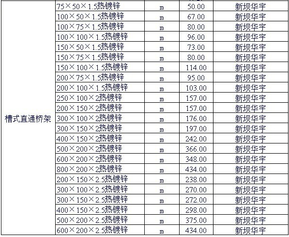 注:1.以上报价含盖板。连接片、螺栓、扣锁等另行计价。2.锌合金镀层与热度锌价格相同。3.防火型桥架Ⅰ型(涂防火涂料)加价30%、Ⅱ型(内衬防火板)加价60%。4.二弯通加价30%、三通加价50%。5.大跨距加强型桥架价格另议。6.托盘式桥架与槽式桥架价格相同。7.喷塑价格下浮20%。 |