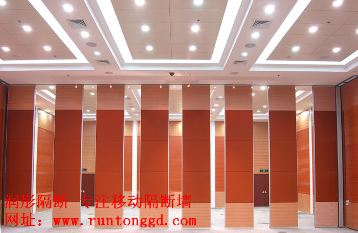 活动隔断又称活动屏风、移动隔音墙、活动隔墙、移动隔断、移动屏风、酒店隔断、隔音屏风、隔断、办公隔断、宴会厅隔断、会议室隔断、移动展板、隔断门、屏风隔断、推拉门、折叠门、趟门。目前该产品被广泛用于星级酒店的宴会厅包间、多功能会议室、餐厅、展览厅、展馆、企业单位的办公室等场所使用,是一种具有高度灵活,稳固和观赏性的活动推拉门,可随意组合和分隔房厅,起到一房多用,一厅多能的作用。润彤隔断活动隔断屏风的产品特点: 1.地面无需安装道轨,只需将轨道安装于天花板上,门板通过吊轮连接起来吊挂。 2.每件屏风里面装有伸缩机构,可起到固定屏风及达到隔音作用。 3.隔热性能优良,根据不同的入座率,可把大空间分割成小空间,以降低空调电耗. 4.采用高效阻燃材料制作,防火性能良好。 5.表面可任意做装饰面,与室内装饰风格完美结合。 6.隔板收放自如,推动灵活,隔板可以隐藏在专用藏板储柜里,不影响整体美观。 7.可应用于会议室、展览厅、餐厅、培训室、多功能厅等商业场所。