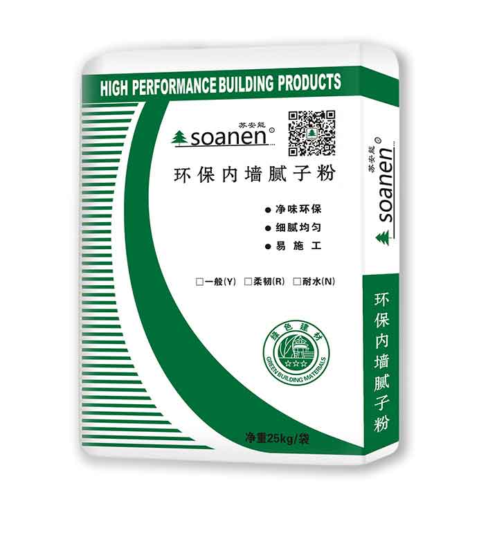 苏安能环保腻子粉,洁白细腻,没有添加有毒有害物质,健康环保;环保腻子粉在高潮湿的环境下使用,不脱粉,不起皮,不开裂;粘接效果好,使用方便简单。该产品主要适用于内墙混泥土面,水泥砂浆面,纸筋灰,石膏板等的基层处理。