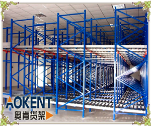 重力式货架系统,以横梁式货架作基础,托盘存放在倾斜面的滚轮上,从一端滑至取货的一端,后续托盘随之向前移动,依据”先进先出“的原则。