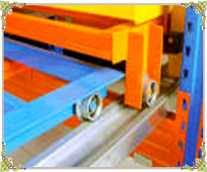 该系统依据\"先进后出\"的原则把货物放置在倾斜的滚道上,运载台车沿轨道运行,托盘放置在运载台车上依次被后推至货架内部,有效深度在5个托盘位.取货时第一个托盘提取后,下一个托盘自行滑至取货点,有效地利用单一通道进行存取,尤其适用于货物中转区的存储管理。