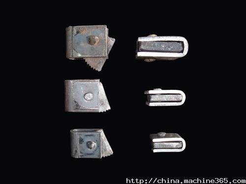 瞿溪制动机械厂生产:Z646钢筋扣能扣住2-6mm钢筋,Z648扣住5-8mm钢筋,园型枕子等.使用时将钢丝套进活动齿牙,一拉即成.但拉力分别不得大于100Kg.1500Kg,钢丝易夹易退,使用方便,齿牙硬度58-60度.拆卸时只需剪断隔板内侧钢筋,其扣便能自动松开.