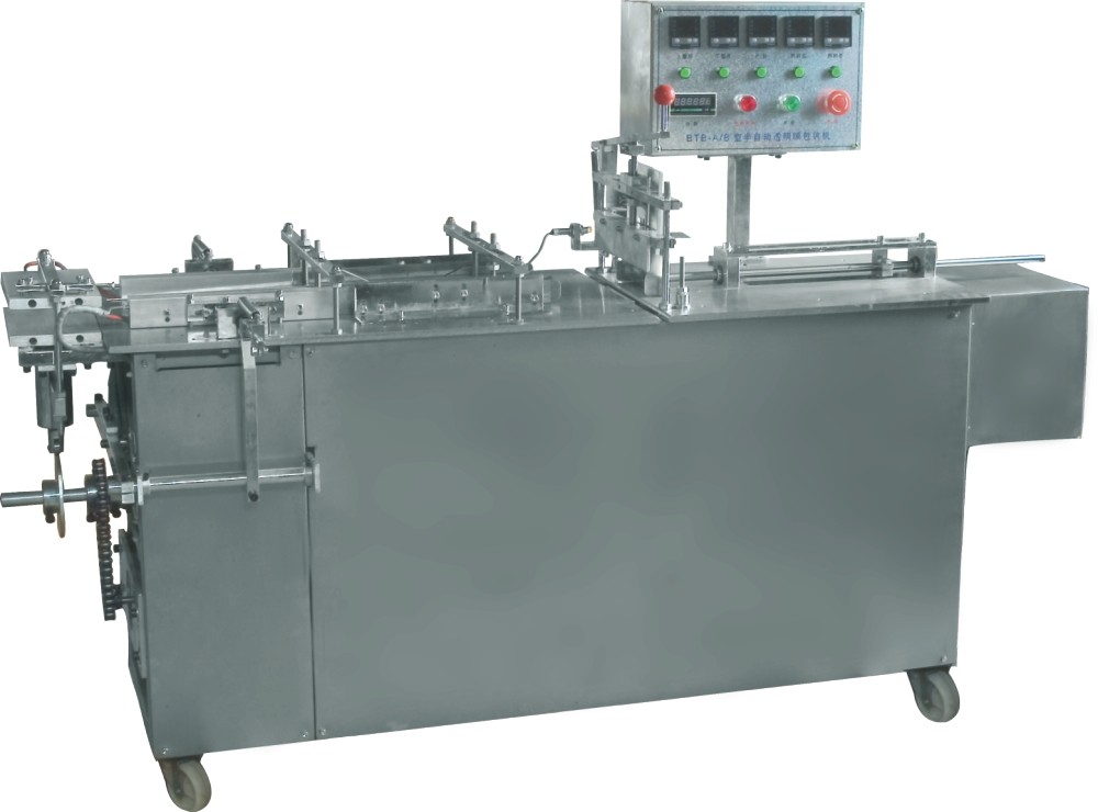 该机用于试纸,化妆品、药品、食品、保健用品、音像制品、文具用品、日用品以及其它的 盒外透明膜三维贴体包装(包装效果与香烟的相同)。 主要特点: 1. 薄膜包装防潮、防尘、防油、防伪功能。 2. 比热收缩包装机大大提高了包装成品率和装饰效果,增强所包装产品的市场竞争力,能使销售量 大增,并提高产品的附加价值。 3. 比热收缩包装机节电百分之八十以上.贰年节约的电费就可购买一台半自动透明膜包装机. 4. 价格低廉,只有不到全自动透明膜包装机的三分之一。 5. 运行稳定,可靠性高,几乎无须维护. 6. 适应性强,一机可完成数十种规格盒子的包装.模具价格低廉,更换简单快捷方便. 7. 整机结构紧凑,占用空间小,重量轻,包装场地几乎不受限制。 主要技术参数
