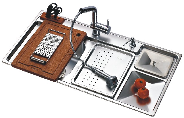 配置:7310全铜抽拉龙头、01皂液器、619刚果沙比利大菜板、不锈钢沥水板、垃圾筒、刀架、蔬果刨、双层双滤大小提笼 (选配:阳江十八子4件套刀)。304板材 1.0mm 尺寸:950*485*210mm开孔:925*460.