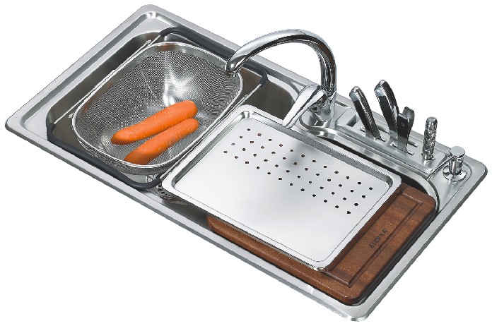 配置:198C全铜龙头、01皂液器、618刚果沙比利菜板、不锈钢沥水板、抽拉沥水篮A、不锈钢刀架、双层双滤提笼 (选配:阳江十八子4件套刀).304板材 1.0mm 工艺:整体拉伸,表面:细拉丝,尺寸:790*440*210mm开孔:770*420mm.