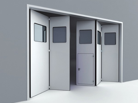 工业门是一种门扇可以折叠的门,当门完全开启时门扇折叠排列在洞口一侧或两侧。因为折叠门门的旋转半径小,门开启后可充分利用门洞为中心之前后空间,因此折叠门可用于大楼走廊,工业厂房,仓库等需要较大有效宽度的地方。