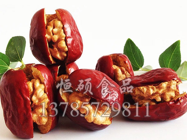 吃枣夹核桃的好处有哪些 红枣夹核桃、红枣加核桃(又名夹心枣)将红枣与核桃巧妙的结合在一起,将两者的营养元素结合在一起。避免了人们繁琐的吐枣,剥核桃皮,吃起来更方便更快捷。长期食用枣夹核桃具有益气养神,补血养颜,补肝降压等功效。适合各类人群,尤其对体质虚弱,老弱病幼,气血双亏者大有收益。 功效作用:核桃,又称胡桃,为胡桃科植物。核桃仁含有丰富的营养素,每百克含蛋白质15~20克,脂肪60~70克,碳水化合物10克;并含有人体必需的钙、磷、铁等多种微量元素和矿物质,以及胡萝卜素、核黄素等多种维生素。核桃中所含脂肪的主要成分是亚油酸甘油脂,食后不但不会使胆固醇升高,还能减少肠道对胆固醇的吸收,因此,可作为高血压、动脉硬化患者的滋补品。此外,这些油脂还可供给大脑基质的需要。核桃中所含的微量元素锌和锰是脑垂体的重要成分,常食有益于脑的营养补充,有健脑益智作用。 1、枣能提高人体免疫力,并可抑制癌细胞:药理研究发现,红枣能促进白细胞的生成,降低血清胆固醇,提高血清白蛋白,保护肝脏,红枣中还含有抑制癌细胞,甚至可使癌细胞向正常细胞转化的物质; 2、经常食用鲜枣的人很少患胆结石,这是因为鲜枣中丰富的维生素C,使体内多余的胆固醇转变为胆汁酸,胆固醇少了,结石形成的概率也就随之减少; 3、枣中富含钙和铁,它们对防治骨质疏松产贫血有重要作用,中老年人更年期经常会骨质疏松,正在生长发育高峰的青少年和女性容易发生贫血,大枣对他们会有十分理想的食疗作用,其效果通常是药物不能比拟的; 4、对病后体虚的人也有良好的滋补作用; 5、枣所含的芦丁,是一种使血管软化,从而使血压降低的物质,对高血压病有防治功效; 6、枣还可以抗过敏、除腥臭怪味、宁心安神、益智健脑、增强食欲。