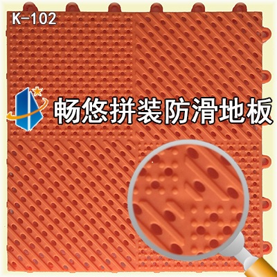 畅悠拼装式防滑地板(硬质) 特点与优势 1、 畅悠拼装式防滑地板K-1系列采用中石化工程聚丙环保原料、添加进口德国巴斯夫/美国埃克森工程辅料精工生产,无毒无害、无异味、抗氧化、抗老化、耐紫外线、抗收缩,绿色环保,不滋生细菌,可回收再利用; 2、 正反面双结构,正面特有人性化防滑颗粒+防滑横条设计,使脚底接触面的防滑性能得到充分增强,有效防止意外滑倒及摔倒事故发生;背面柱形形成的弹性支撑结构,提供良好的缓冲与支撑; 3、 正方形模块化设计,保证了拼装的美观程度,红、橘黄、蓝、绿常备国标色库存,亮丽清新,可配合室内外环境需要自由组合,任意拼装出各类精美图案,大大提升使用环境专业性及档次; 4、 表层特殊亚光处理,不吸光,室内外强光下不反光刺眼,不易产生视觉疲劳; 5、 无底式结构排水,排水通畅,有效改善涉水湿滑地表,时刻保持地面干爽; 6、 国际通用标准设计,耐候性强,高温下不软化,低温下不脆裂,抗紫外线、抗辐射、耐踩踏、耐油脂、耐酸碱腐蚀、耐冲击、抗氧化、不易磨损、不易褪色; 7、 锁扣式连接方式,安装方便、快捷,无需专业人员施工;可多用途反复拆装及无限制移动;安装前对基础要求低,只需平整即可,维护方便、易于清洁; 8、 适用于大面积平铺、不规则区域或小空间铺装;各类游泳馆、洗浴、温泉、水上乐园、更衣室、公共卫生间、健身房、商超门口等室内外涉水及非涉水场所均适用; 9、 采购畅悠拼装式防滑地板投入少,不影响铺装场地日常经营;清洁维护成本低、档次高、铺装快捷、使用寿命长,是各种涉水及非涉水类防滑场地铺设的最佳选择。