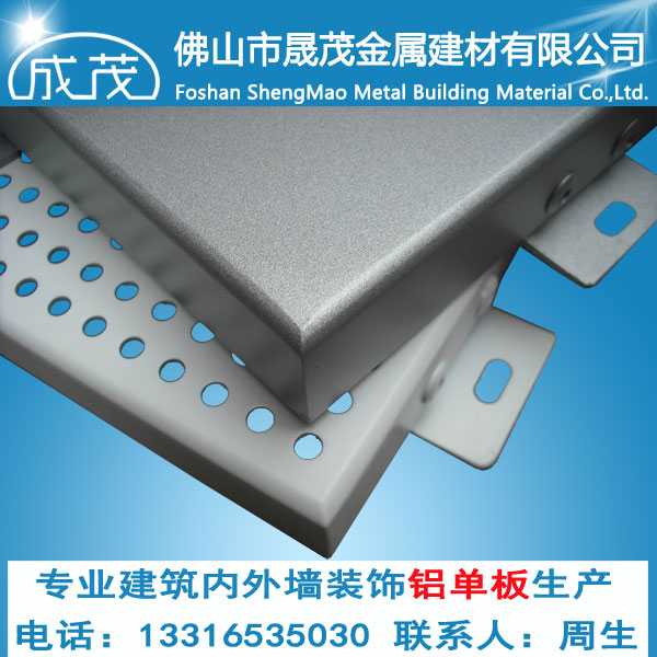 铝单板幕墙基材采用1100H24、3003H24、5005H24等幕墙专用单层铝合金板。从规格上分为两种:厚度在1.2mm以下的铝单板称为铝扣板(也叫铝方板),厚度在1.5mm以上的铝单板称为铝单板。铝单板幕墙采用优质高强度铝合金板材,其常用厚度为1.5、2.0、2.5、3.0MM,型号为3003,状态为H24。其构造主要由面板、加强筋和角码组成。角码可直接由面板折弯、冲压成型,也可在面板的小边上铆装角码成型。加强筋与板面后的电焊螺钉(螺钉是直接焊在板面背面的)连接,使之成为一个牢固的整体,极大增强了铝单板幕墙的强度与刚性,保证了长期使用中的平整度及抗风抗震能力。如果需要隔音保温,可在铝板内侧安装高效的隔音保温材料。