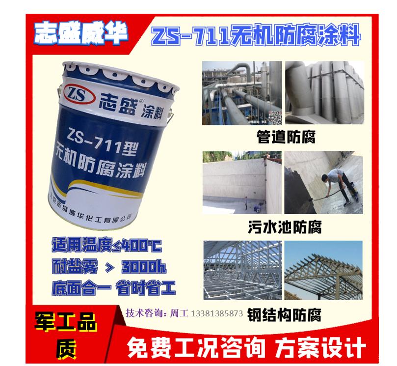 一般情况钢结构的腐蚀可以用711灰色解决,对于酸碱性高,腐蚀环境恶劣的工况,可以采用ZS711无机防腐涂料(黑色)或者ZS811耐高温防腐涂料(浅黑)这两款进行重防腐。